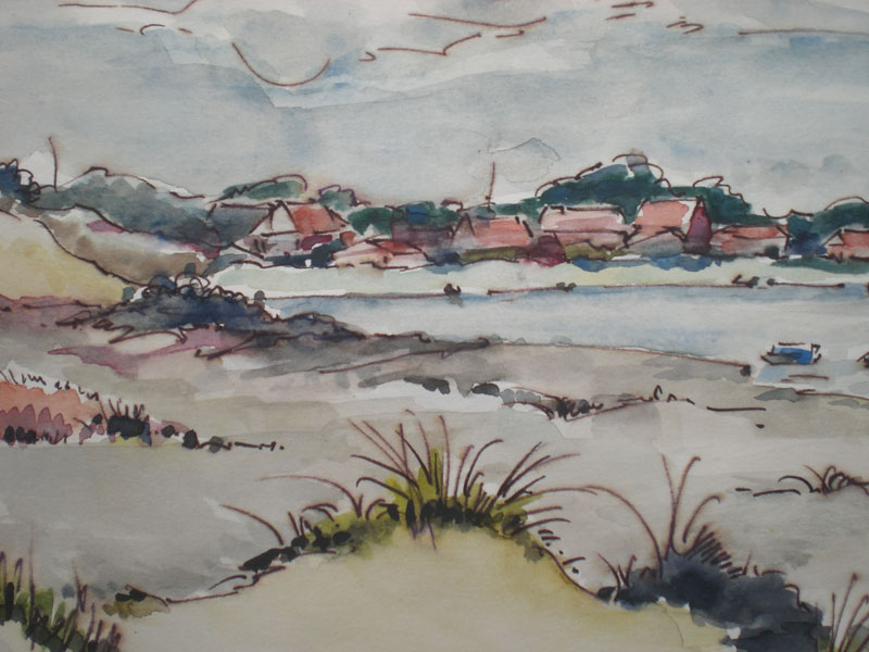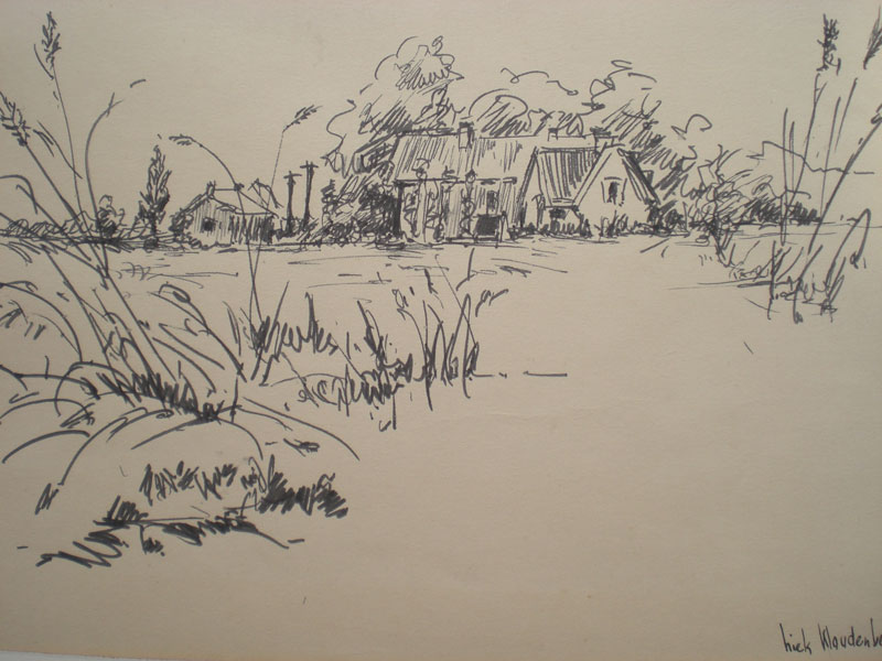 3 tekeningen van Niek Woudenberg Nicolaas Pieter Woudenberg (1921-2002) Gezicht op Vlieland. Aquarel op papier. Oudegracht Utrecht. Aquarel op papier. Huizen tussen koren. Pentekening. Op de zolder van de Schildersvakschool hield Jan van Scorel een keer per week een modeltekenavond. Niek was, evenals veel andere leden, een trouw bezoeker van deze avonden. Maar er werd ook geëxposeerd. In Woudenbergs bezit bevond zich een exemplaar van de catalogus van de tentoonstelling die het genootschap in februari en maart 1946 had in de Utrechtse vestiging van Vroom & Dreesmann. Ook bezat Woudenberg nog een exemplaar van het mededelingenblad van de groep (nr. 11 van de jaargang 1947) met daarin een bijdrage van zijn hand onder de titel 'Het "Kunstwerk"', een verhaal waarin de auteur zijn innerlijke strijd bij het vervaardigen van een schilderij weergeeft. Twee jaar na de Tweede Wereldoorlog viel het genootschap Jan van Scorel uiteen. Enkele jaren later is Woudenberg naar de opleiding van Artibus overgestapt. Hoewel hij een zeer goed tekenaar was, raakte hij steeds meer geboeid door de mogelijkheden die de fotografie hem bood. Hij werd uiteindelijk ook als fotograaf bekend. Niek Woudenberg heeft aan diverse fototentoonstellingen deelgenomen. Zijn fotografisch werk was in 2004 te zien in het Stedelijk Museum te Vianen. |